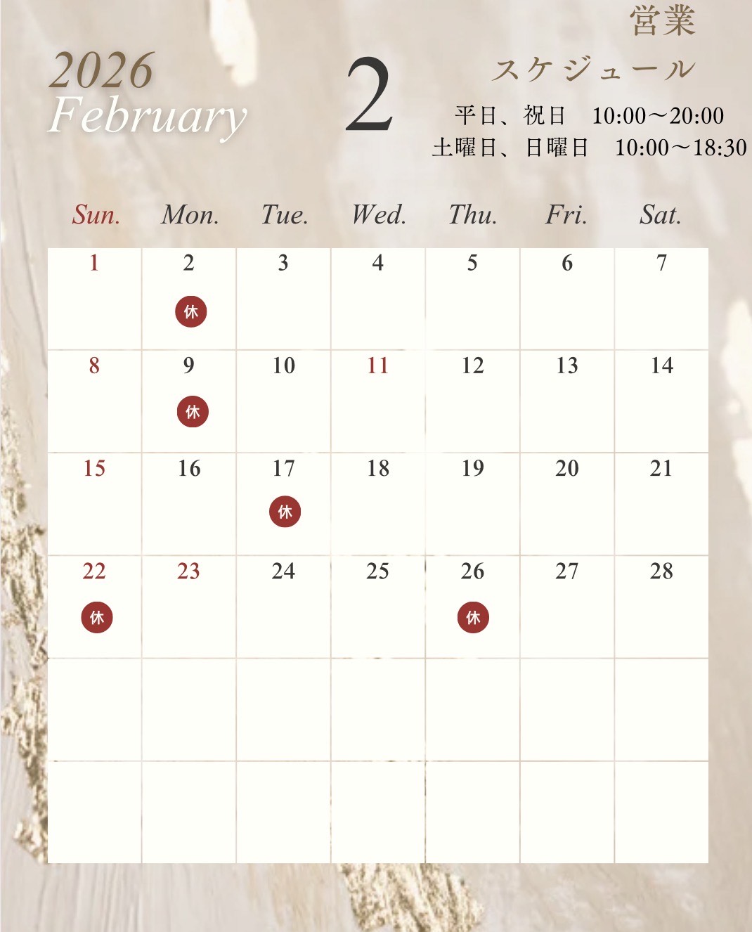 2月の店休日のお知らせです❄